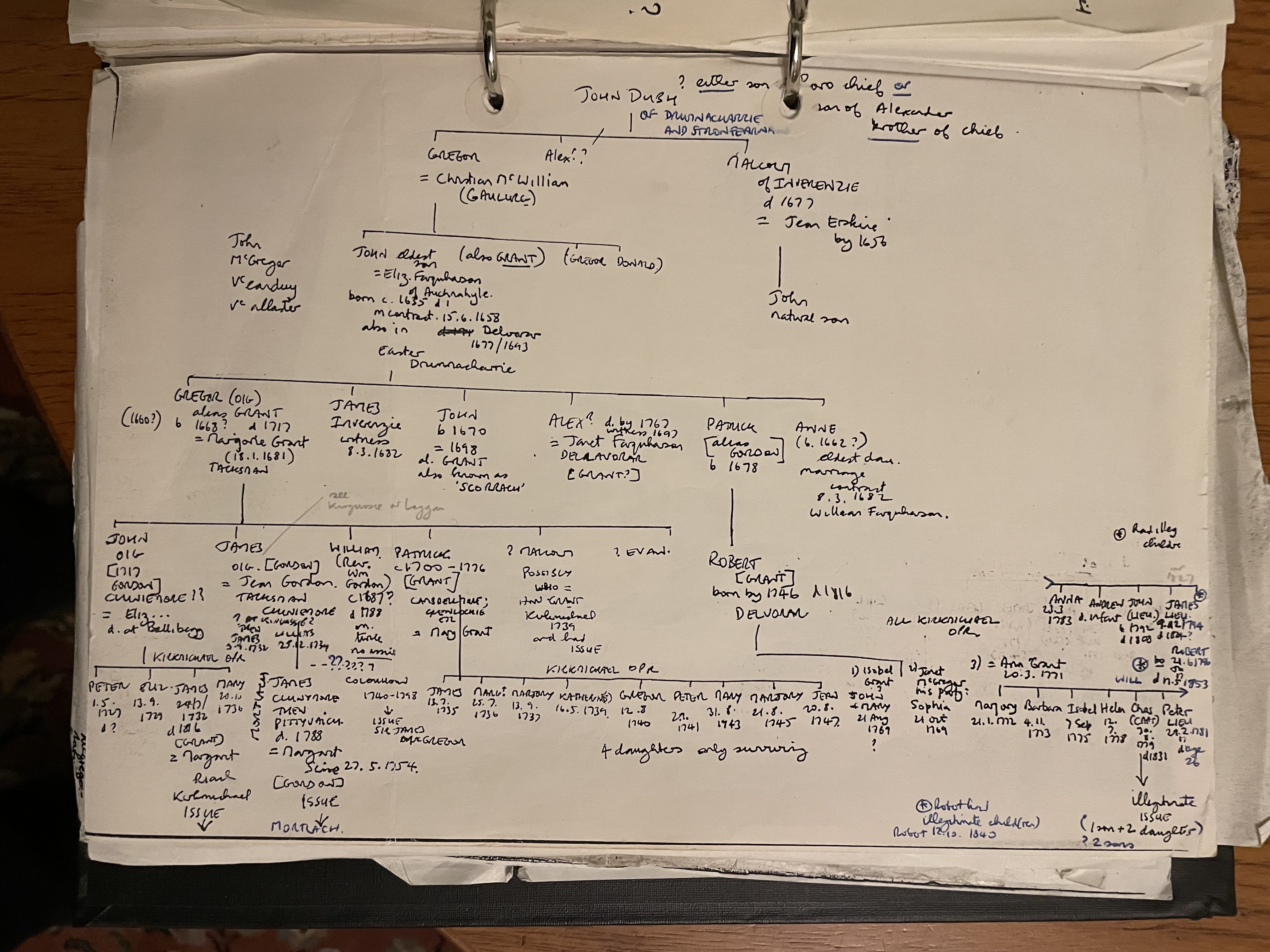 Back to 101 - Descendants of Gregor Mòr in Glengairn Iain dubh, Easter Drumnachrie [0] b.~1572 executed 1612 Iain dubh was the father of 101 - Duncan of Ardochie so Gregor would be a younger brother The descendants of Gregor are taken from Burkes Peerage but I have not been able to corroborate any of the following with the OPRs | | |